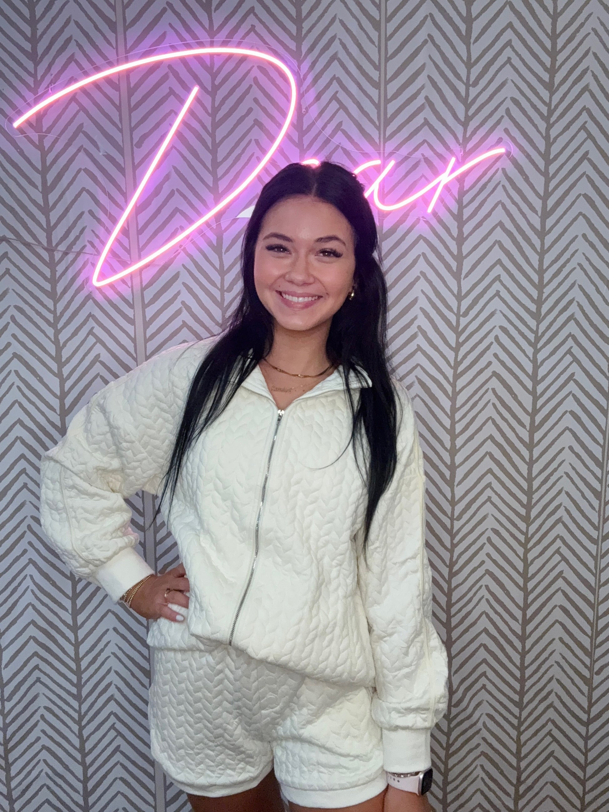 The Again and Again Set is a two-piece set with a quilted zip-up jacket featuring ribbed cuffs and hem,