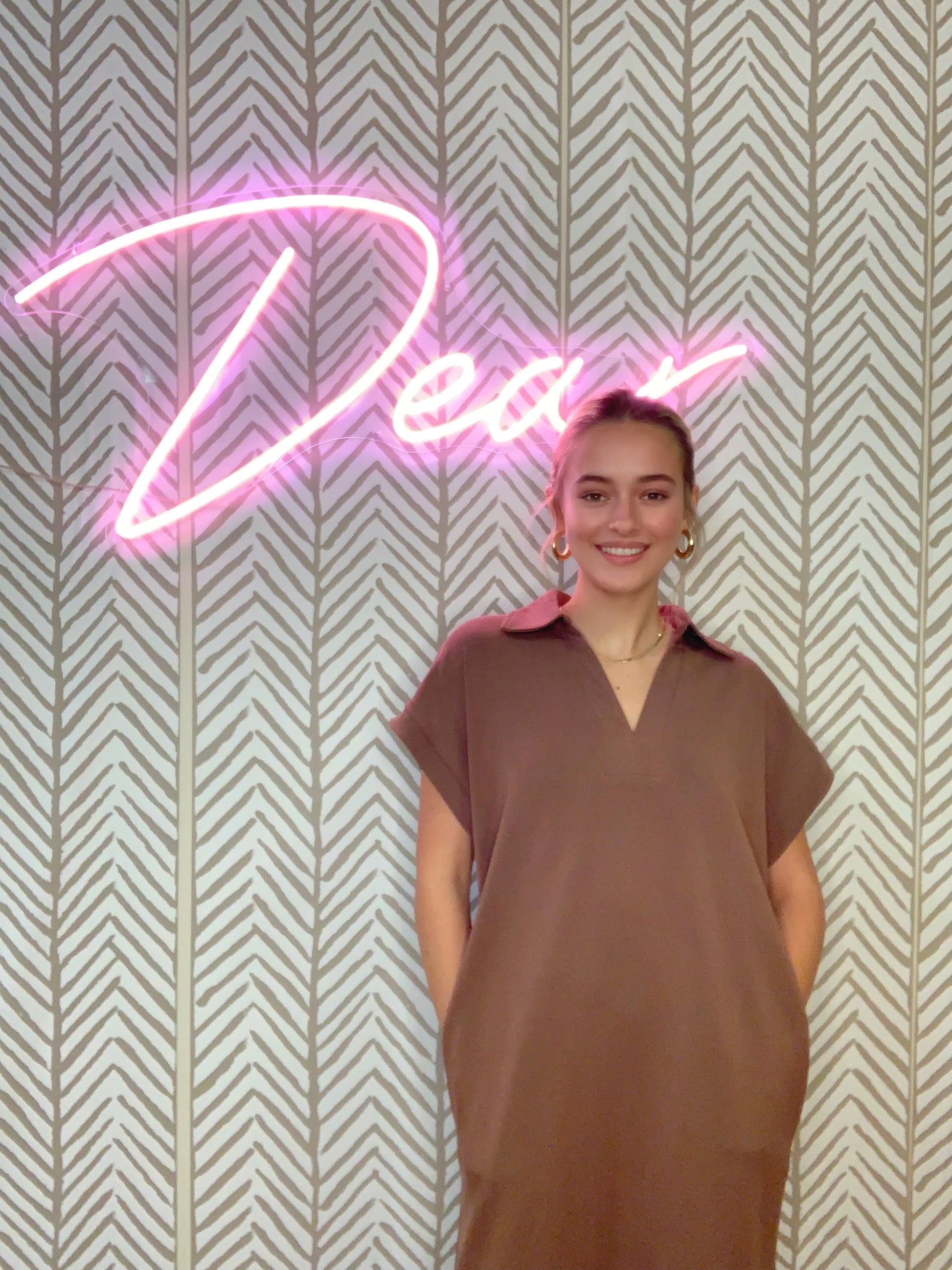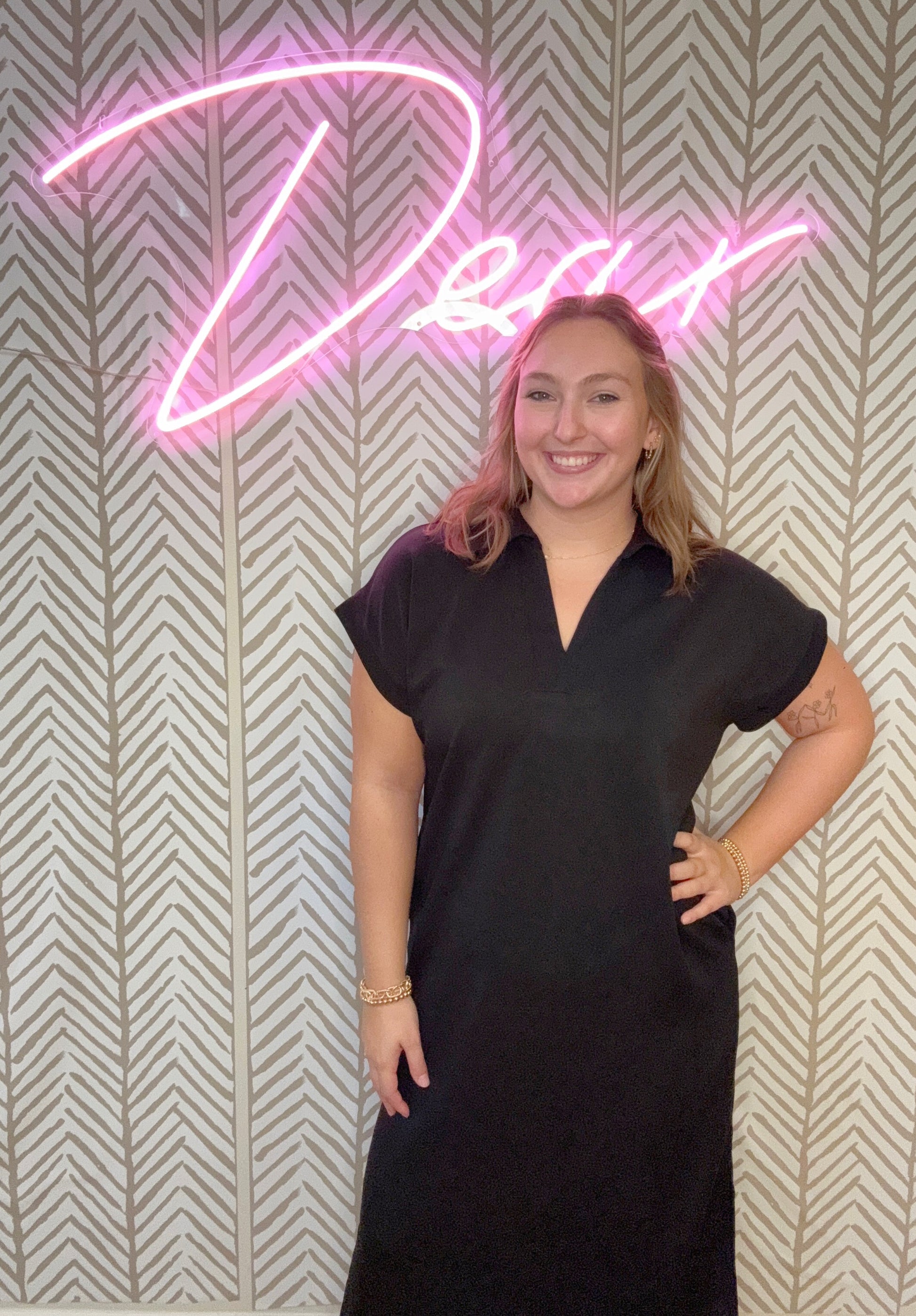 The Be Me Dress is a midi dress with open collared neck, side pockets, short kimono sleeves, band cuffs, and side slit detail.