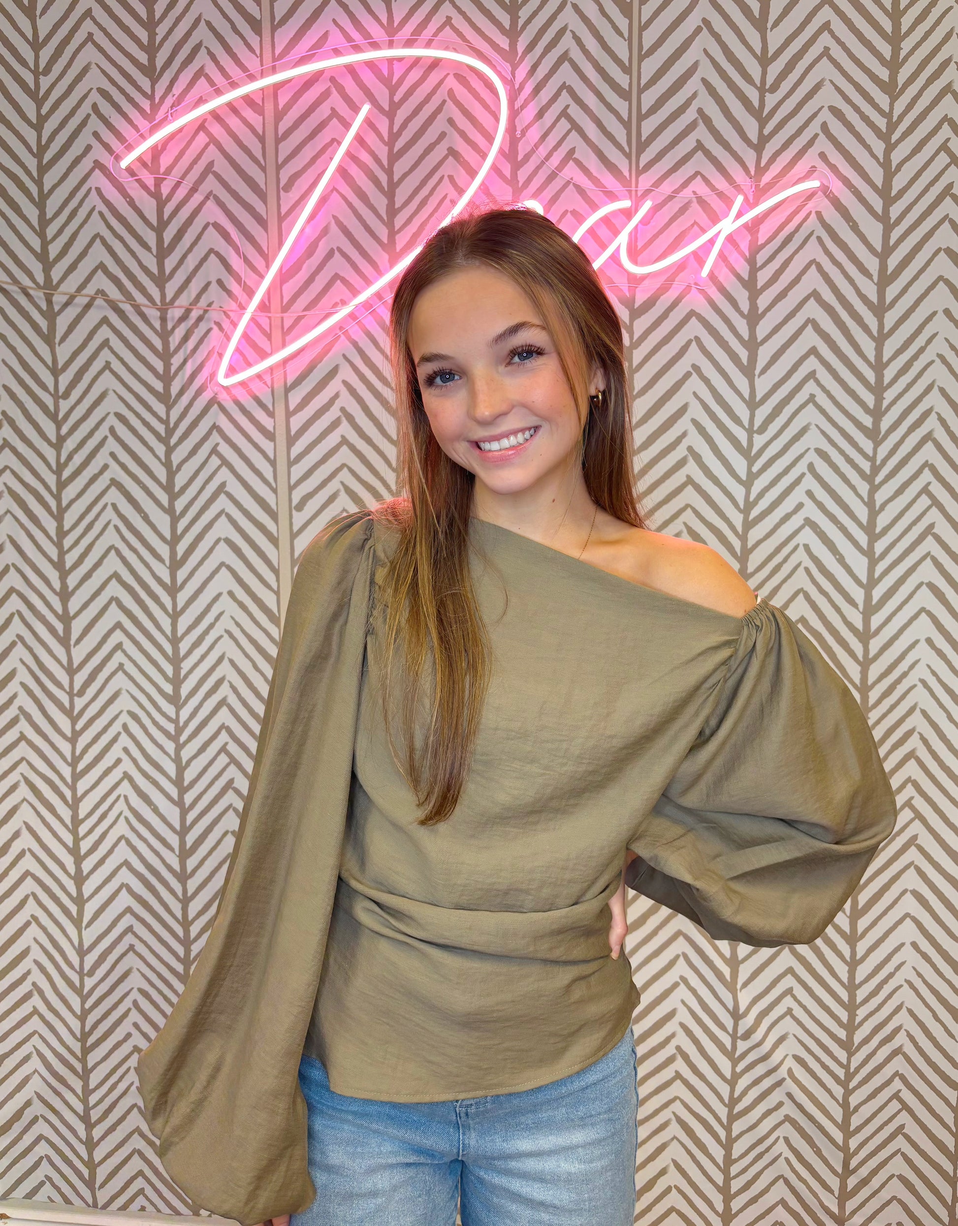 The Beautiful Day Top is a long balloon sleeve one shoulder neckline one side waist draped shirring detail top. Side invisible zipper.