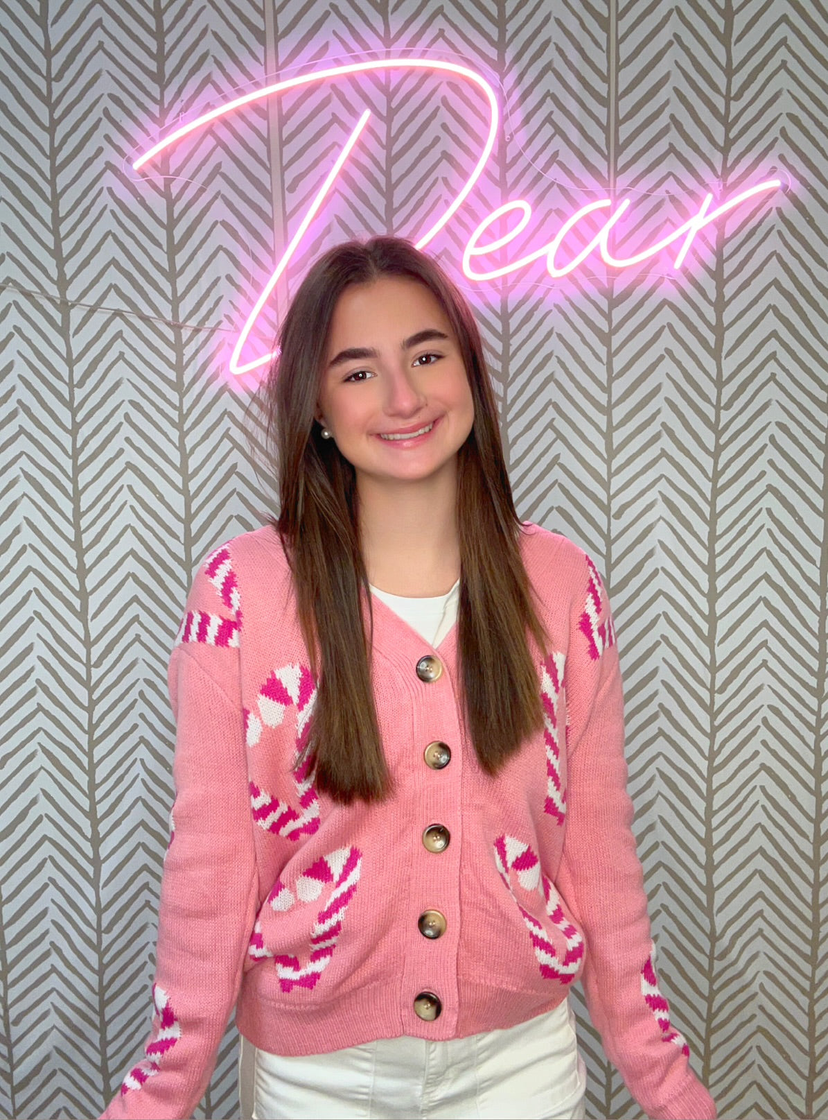 The Candy Cane Cardigan is an embroidered sweater with candy cane detailing and button closure down the front.