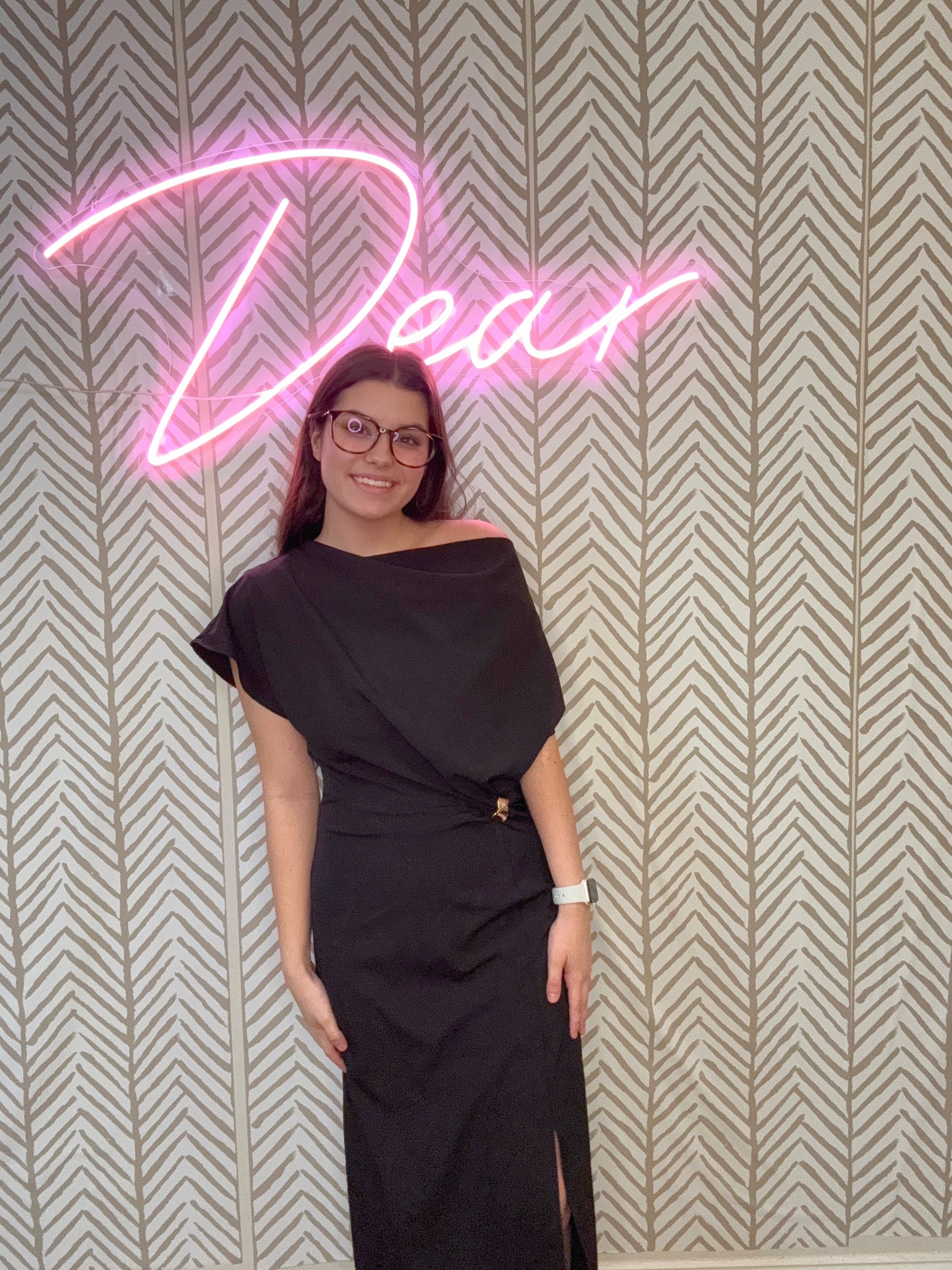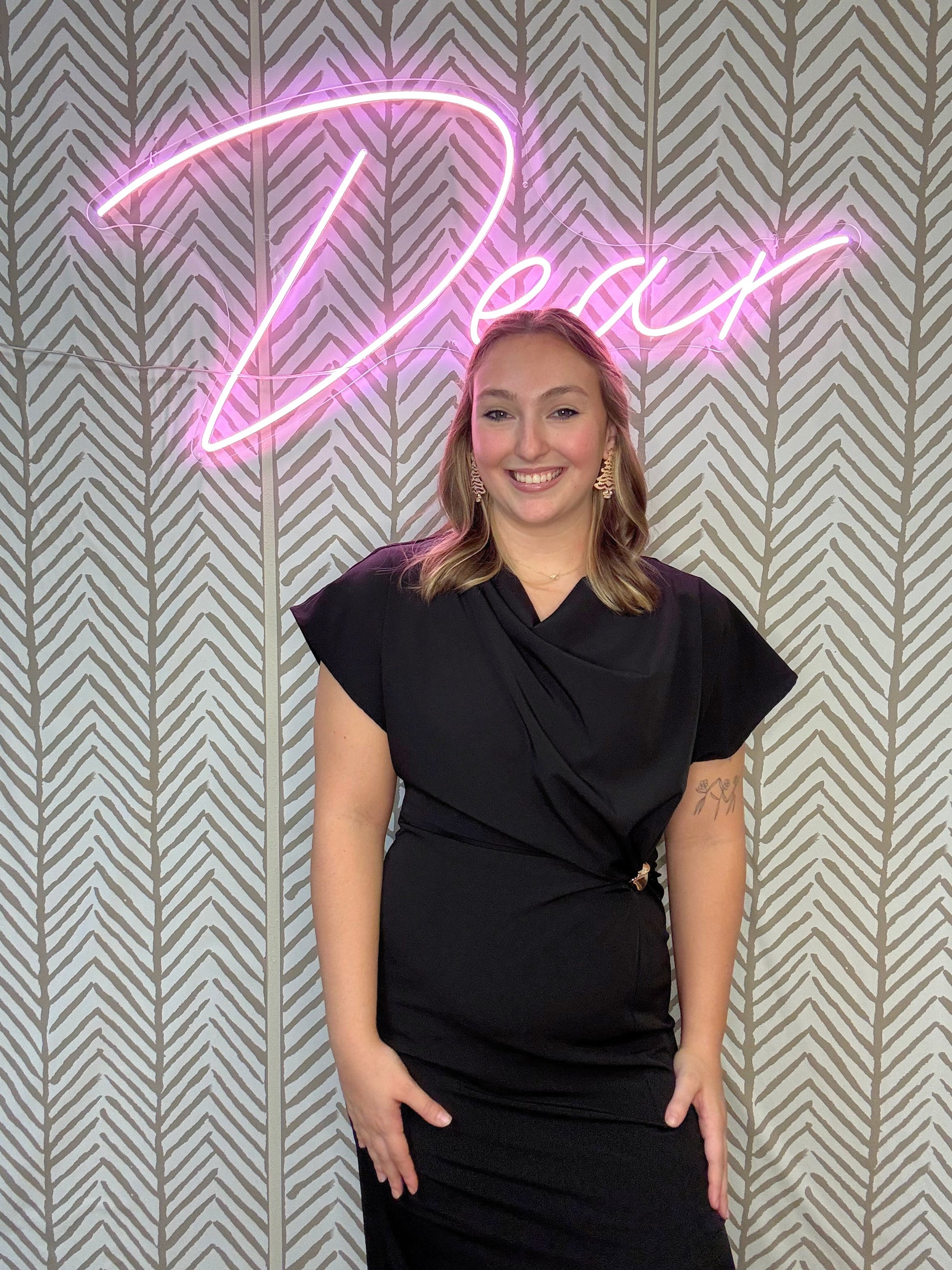 The Dream On Dress is a midi dress with a short cap sleeve and a rounded neckline. It features gathering and a gold embellishment at the waist with a slit at the leg.