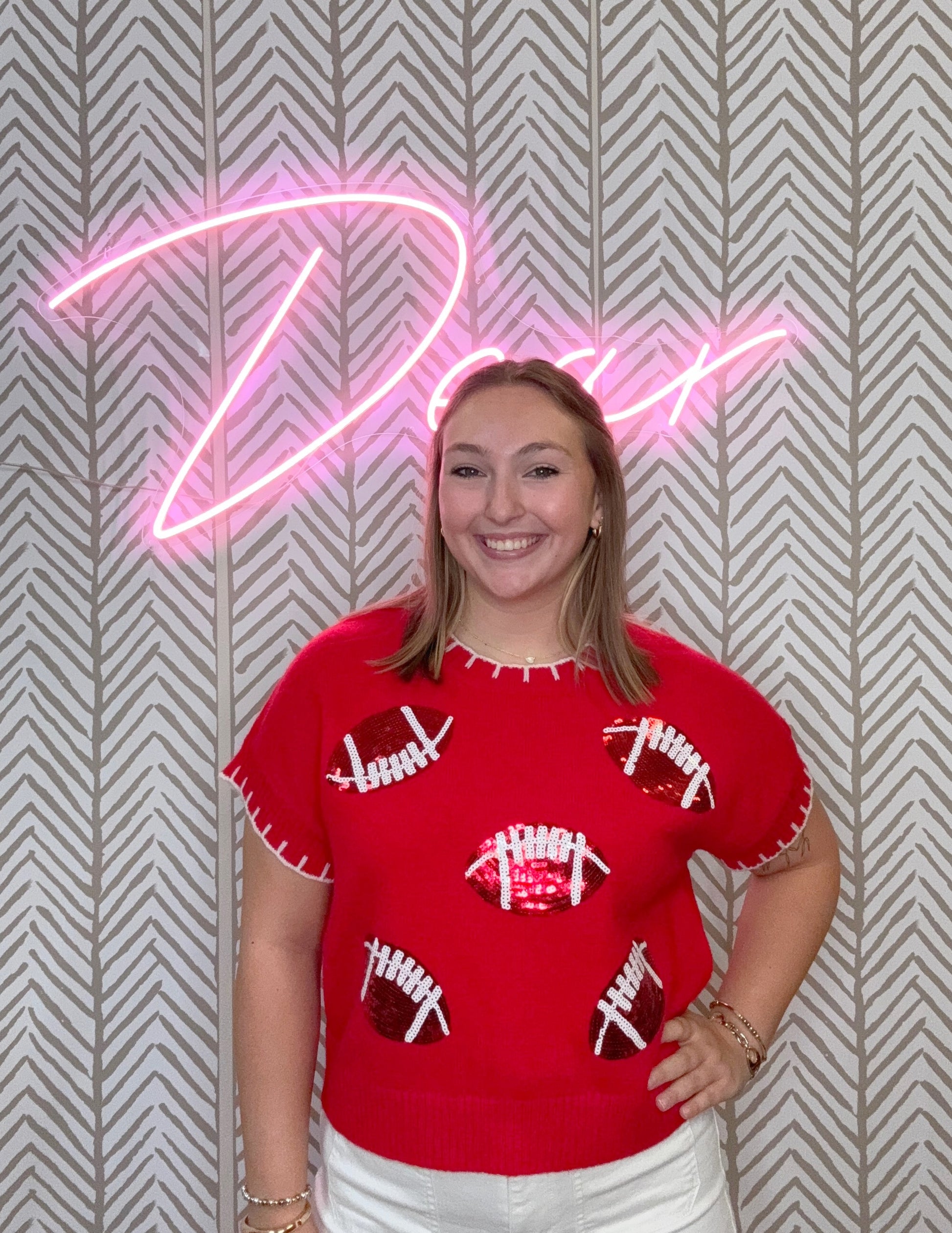 The Football sweater is a sequin football pattern with a ribbed waistline,