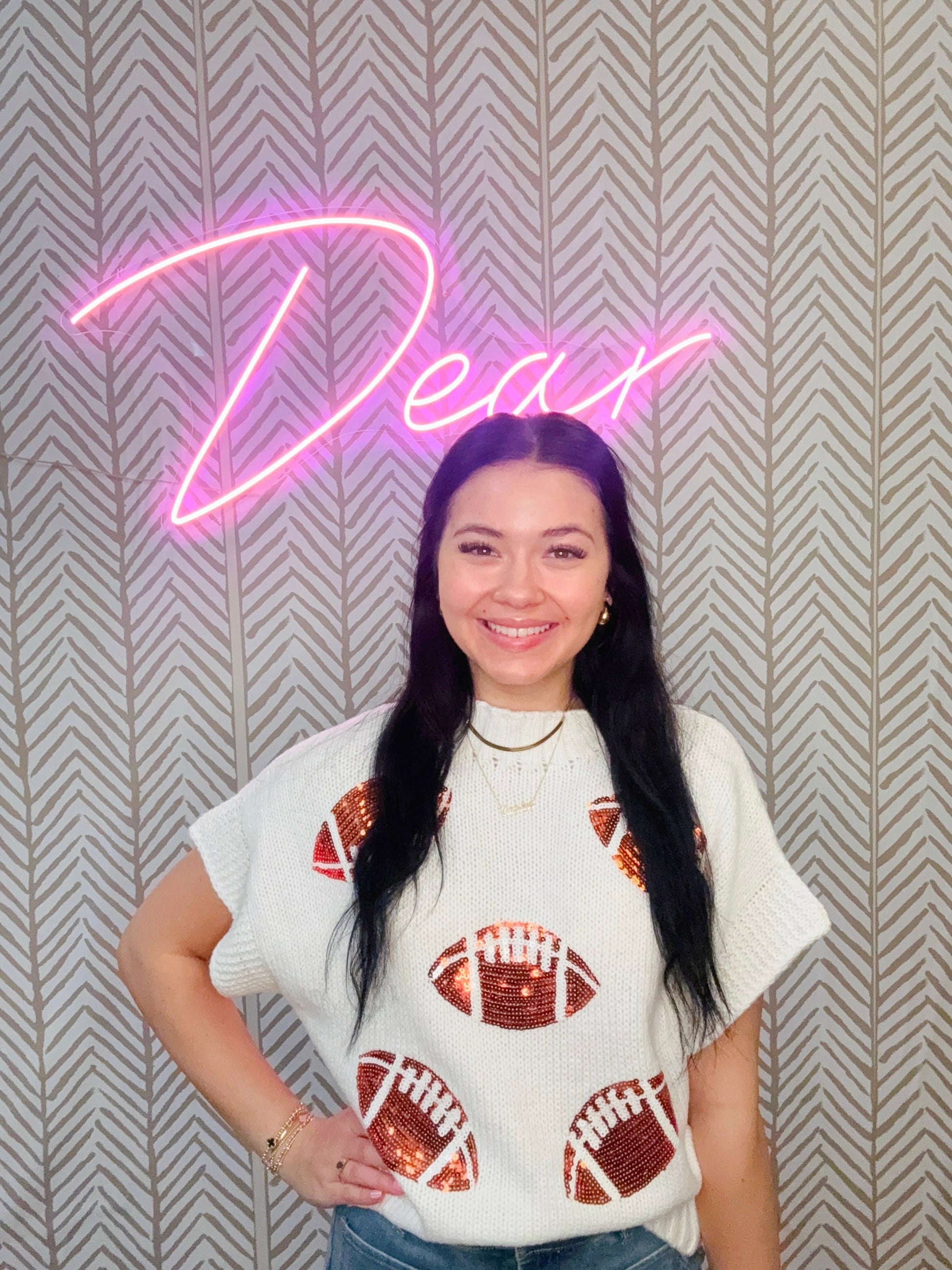 The Football Sweater II is a short sleeve sweater with football sequin football patches and ribbed banding at sleeves and waistline.