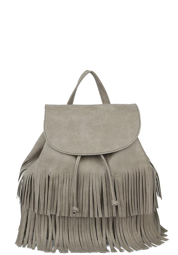 The Fringe Backpack is a smooth textured fringe backpack with a magnetic flap and drawstring closure.