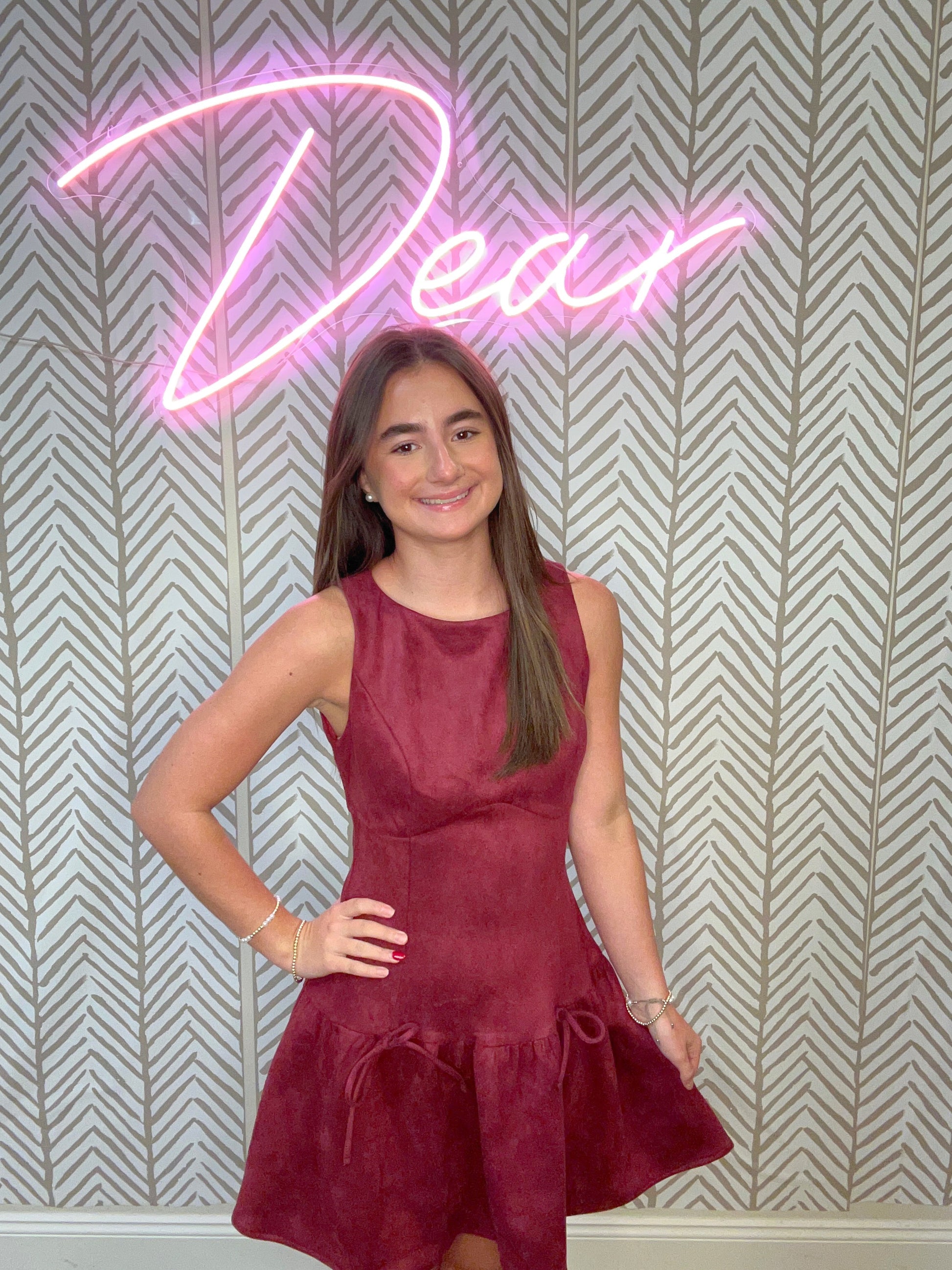 The Happy Day Dress is a sleeveless suede mini dress with a drop waist and bow detailing at the sides.