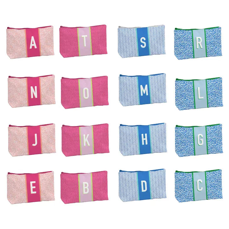 The Initial Travel Pouch has a waterproof lining with gold hardware. It is medium size and measures 8x11.