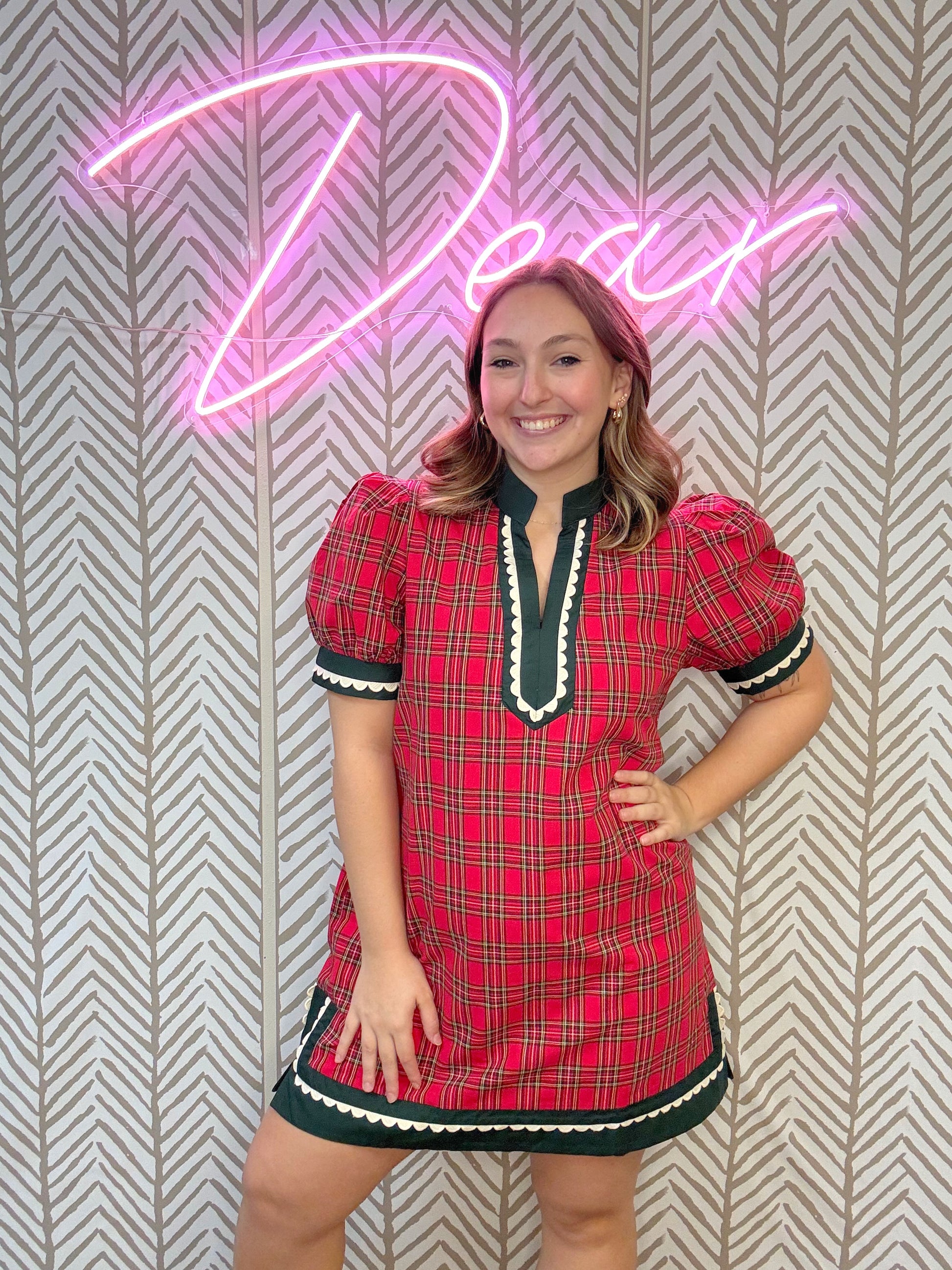 Jingle All the Way Dress is a short sleeve mini plaid dress. It features a contrasting color at neckline, sleeves and hemline with a v-neckline.