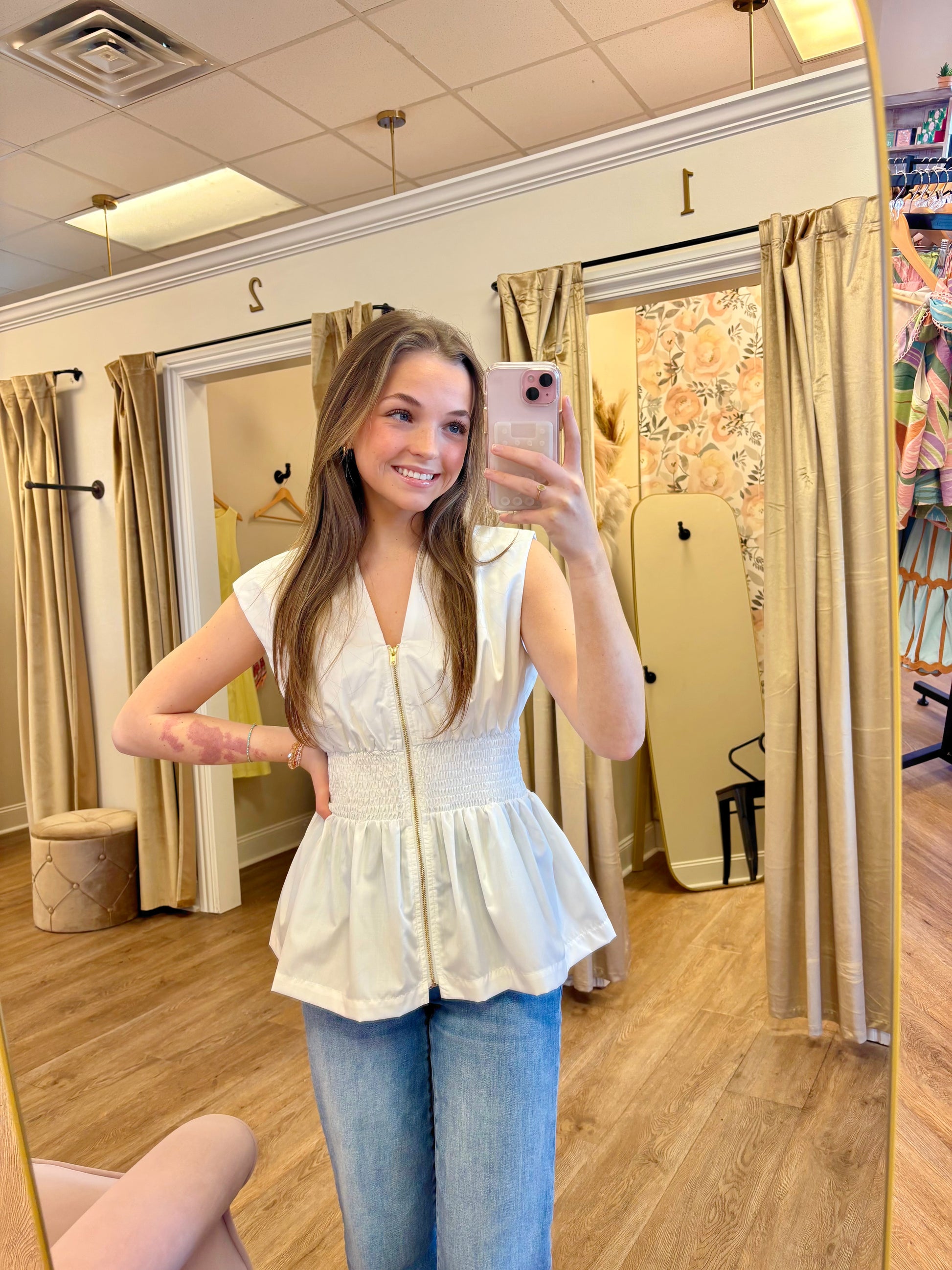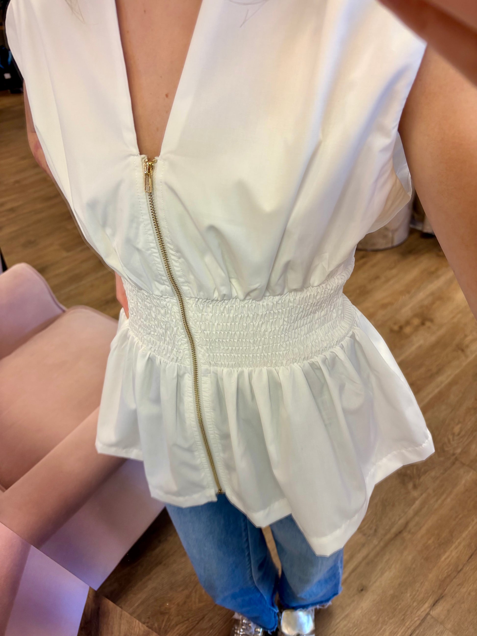 The Please Don't Go Top is a solid sleeveless top featuring wide smocked waist with peplum hem. Zipper closure at front.