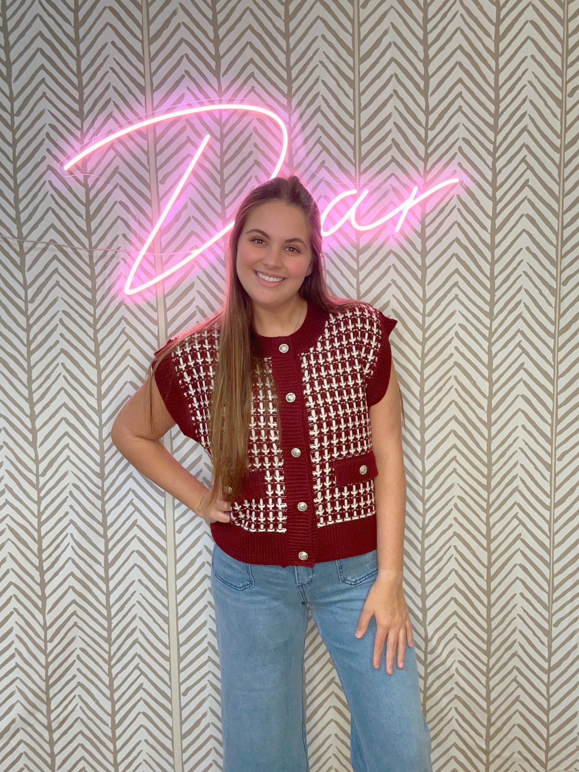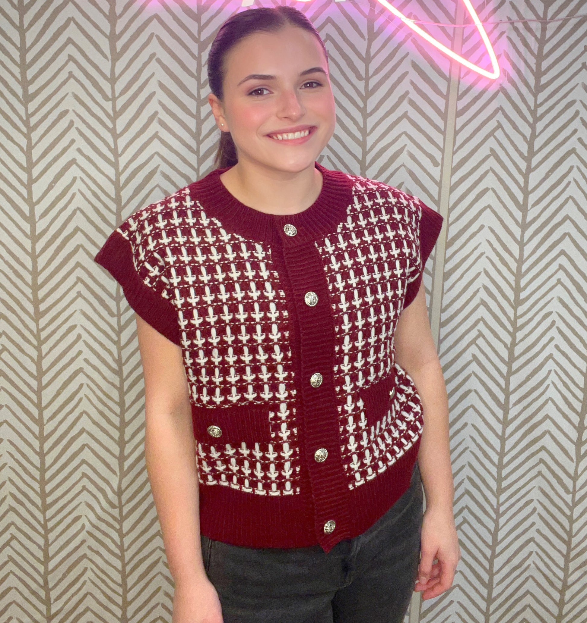 The Save Me Sweater is a sleeveless sweater top with gold button down closure.