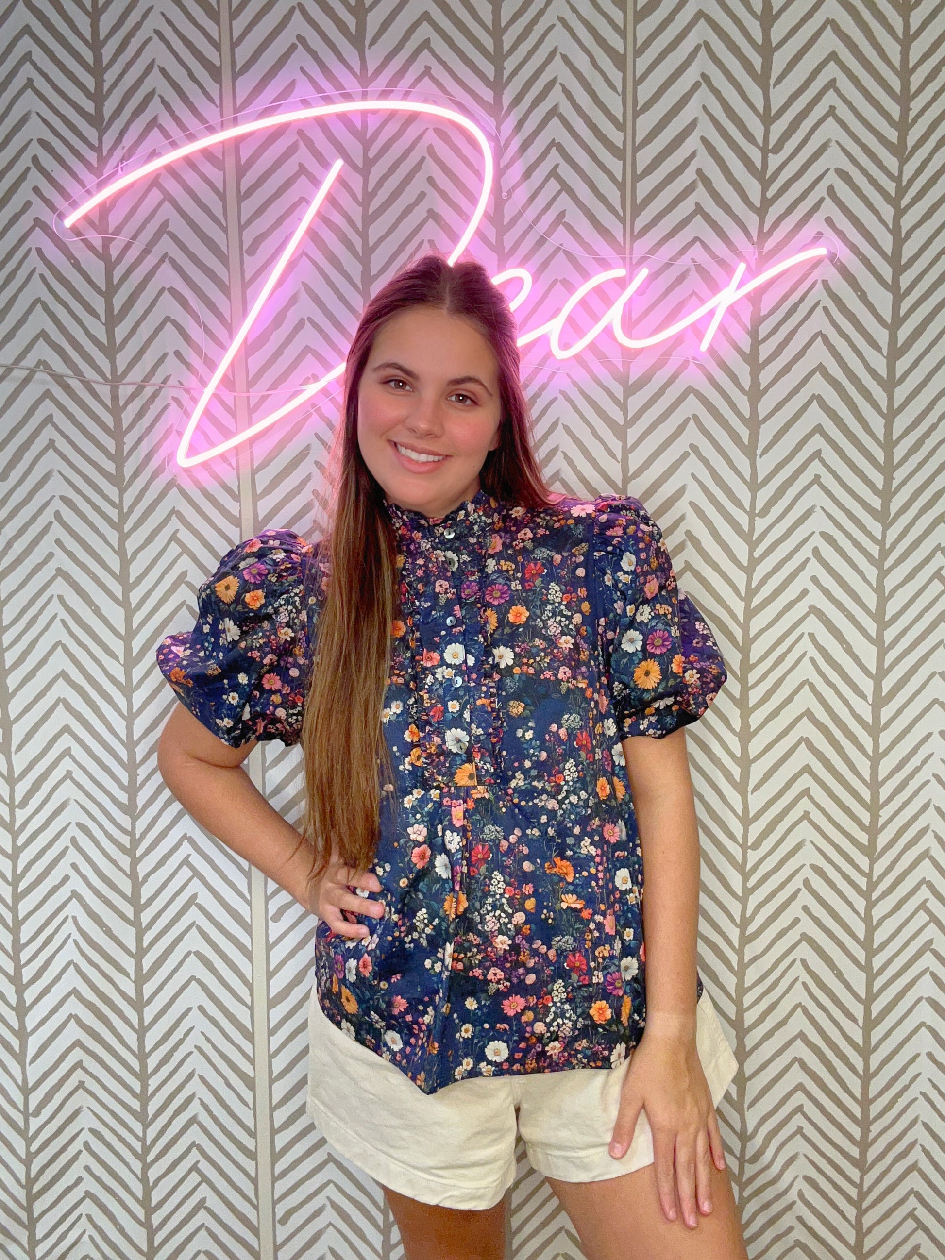The Share Your Time Top is a floral print ruffle band collar short bubble sleeve top featuring ruffle smocked frill accent button closure at front.