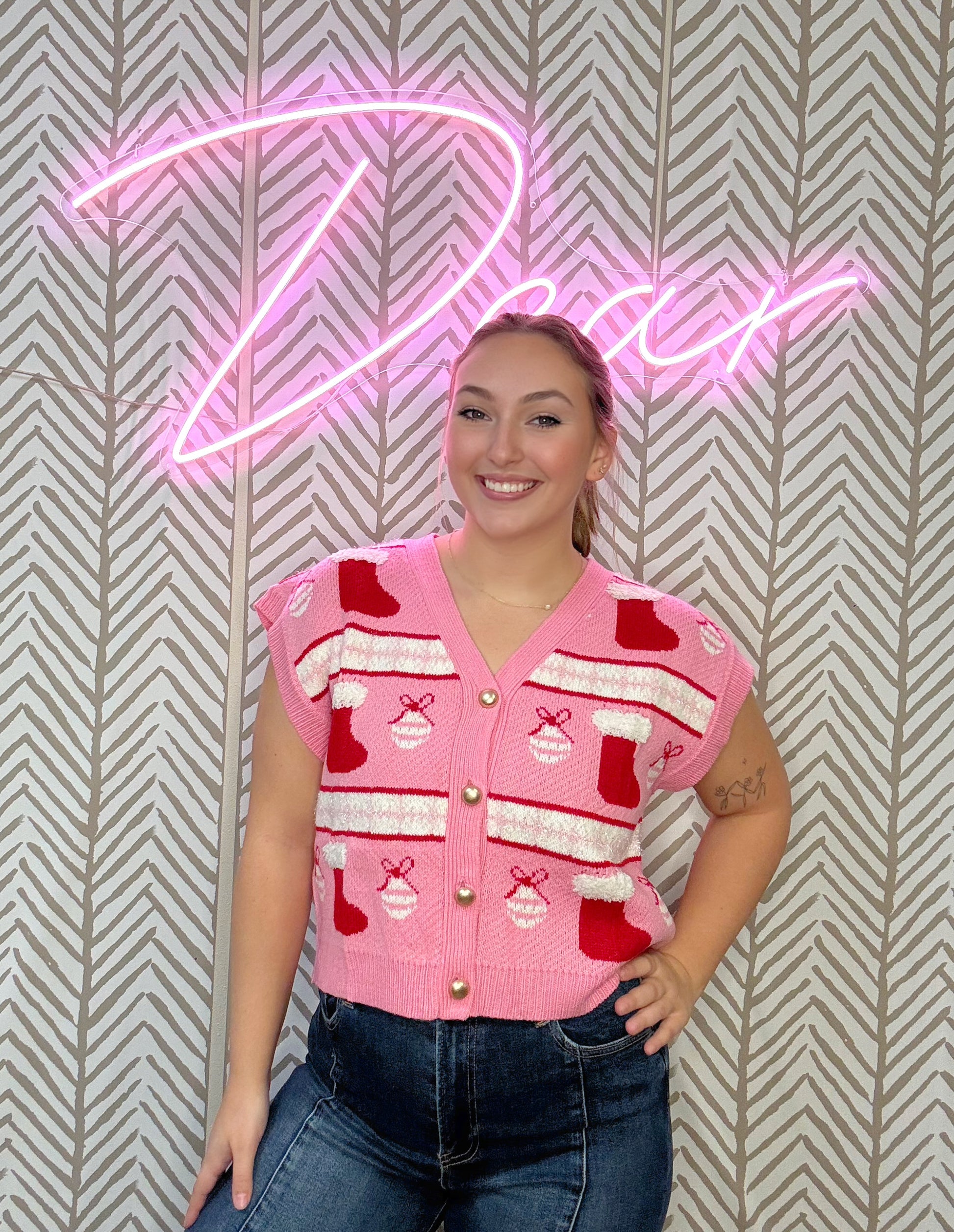 The Stockings Galore Vest is a sleeveless vest with stocking detailing and a button front closure.