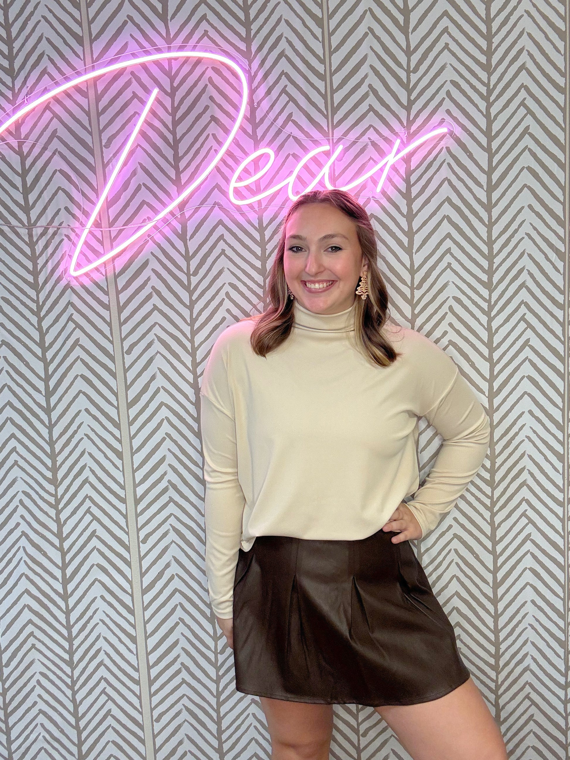 MID RISE PLEAT BROWN PU SKIRTS VEGAN LEATHER STRETCH REGULAR HEM EXPOSED METAL ZIPPER WB WITH SNAP BUTTON PLEAT DETAIL