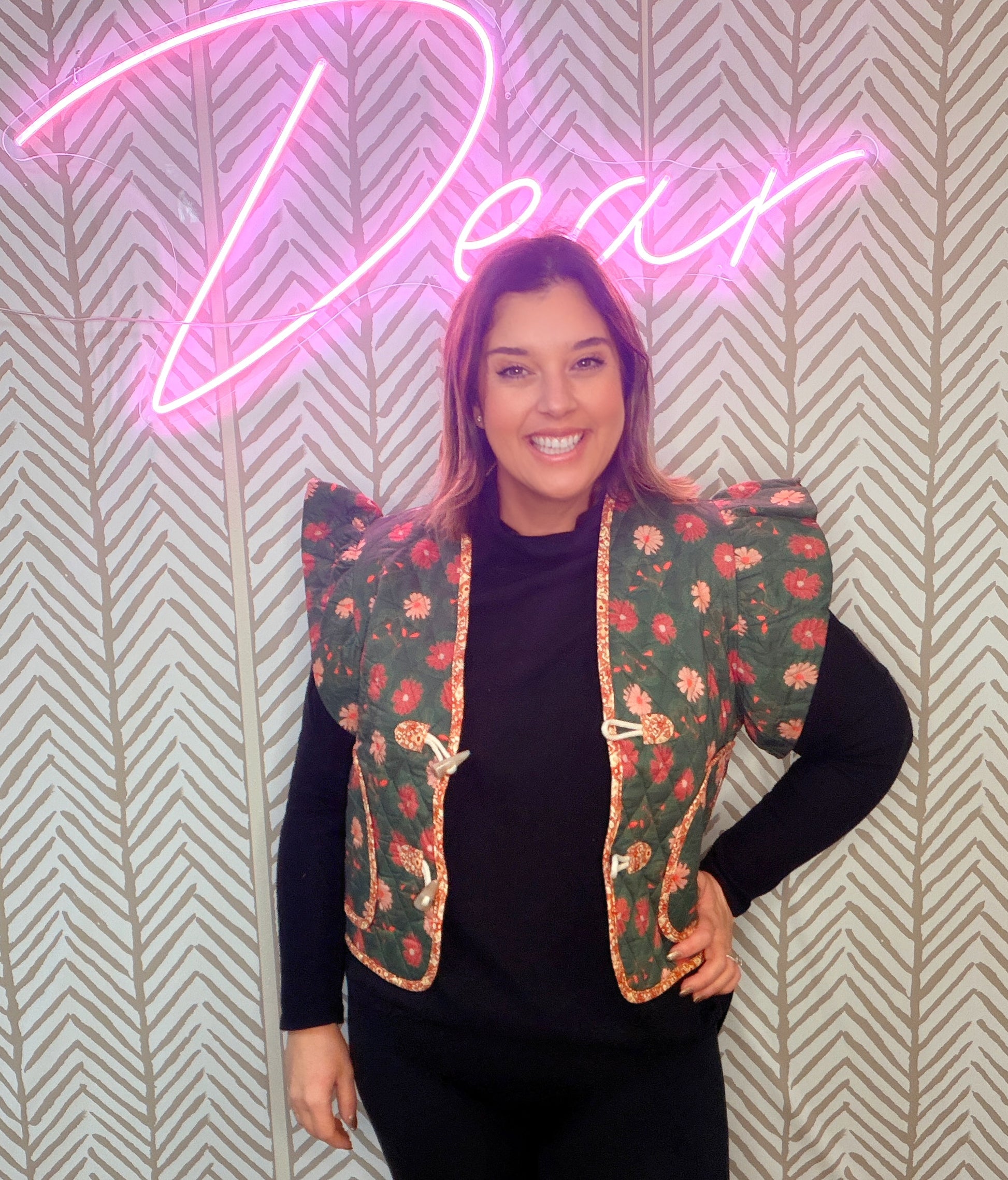 Floral print quilted puff ruffle sleeve waist-length vest featuring contrastn accent binding finish. Toggle closure at front. Front pockets